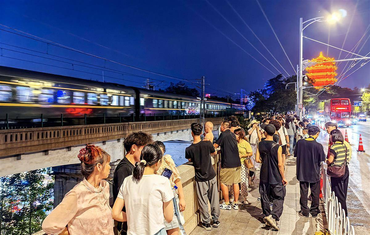 9月7日晚上,许多游客被排队为Wuchang Bridge的火车和黄吊楼等框架拍照。右边是吉尚(Guishan)的导游,是北京 - 古祖铁路(Beijing-Guangzhou Railway),后面是黄色起重机塔,它是与黄色起重机塔和火车同一框架中游客的最佳机场。 (每天都会摄于湖北媒体记者的Zhu Xiyong)